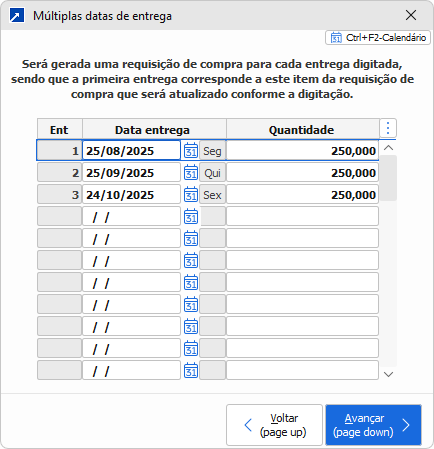 Aceita as contas de despesa do planejamento financeiro para o item da requisição de compra. Permite informar o percentual do valor do item para cada conta.