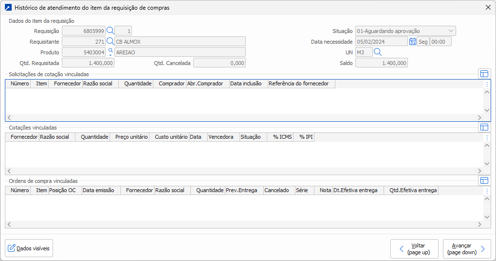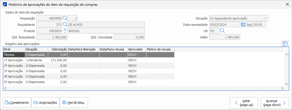 Se houver necessidade de alguma aprovação, a requisição ficará pendente (status de Aguarda Aprovação) e não aparecerá na lista de atendimentos do departamento de compras, mas sim na lista de requisições pendentes dos aprovadores.