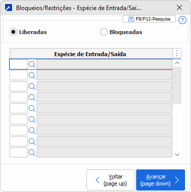Espécie de Entrada e Saída Bloqueios e restrições relacionadas a tabela genérica "62 - Espécie de Entrada/Saída".