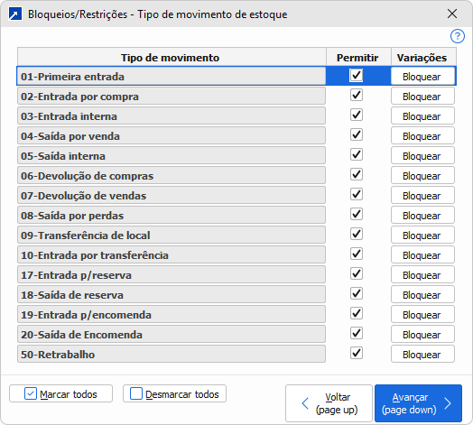 Tipo de Movimento de Estoque Bloqueios e restrições relacionadas a tabela por empresa "34-Tipo de Movimento de Estoque".