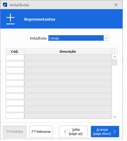 Permite selecionar a quais representantes o usuário possui acesso. Quando selecionado, habilita um botão para incluir ou excluir representantes em lista.