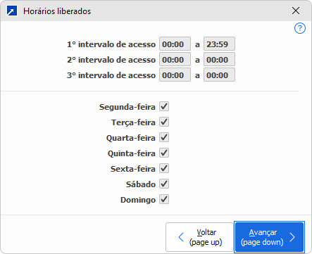 Horários inicial e final de acesso permitidos para esse usuário. Fora desses intervalos o usuário não conseguirá abrir o SIGER®.