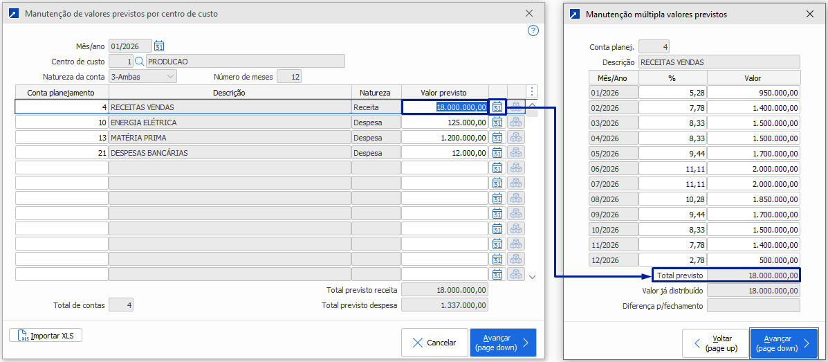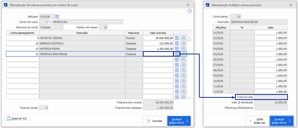 A partir deste menu é possível incluir os valores previstos e editá-los, incluindo novas contas, ajustados os valores atuais e excluindo-os, tratando-se de um recurso bastante versátil para manutenção dos valores previstos.