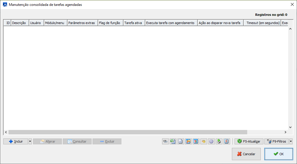 Manutenção Consolidada Na tela de Manutenção consolidada é possível verificar quais tarefas estão programadas. Dentro deste menu pode-se: incluir, alterar, consultar ou excluir uma tarefa agendada.