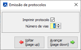 Ao gravar a inclusão do protocolo será exibida a janela "Emissão de protocolos", para imprimir o protocolo marcar o campo "Imprimir protocolo" e definir o número de vias no campo "Número de vias".