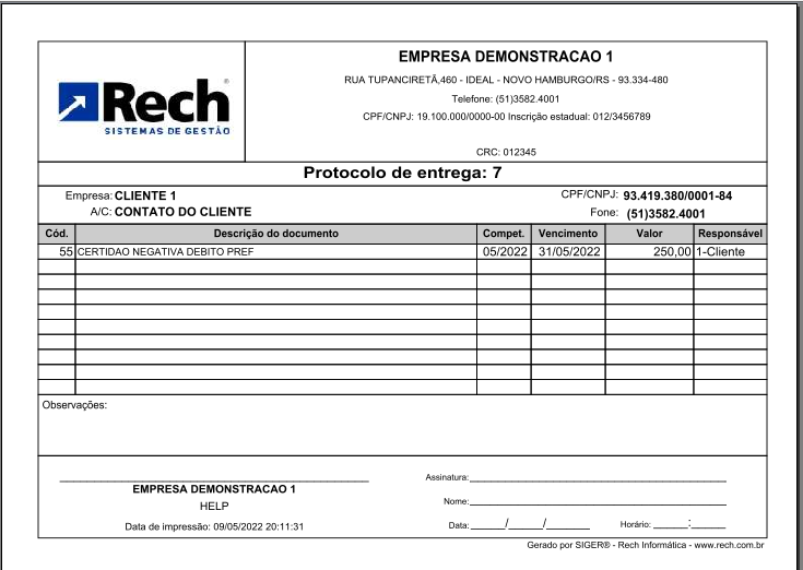 Exemplo da impressão do modelo de protocolo: