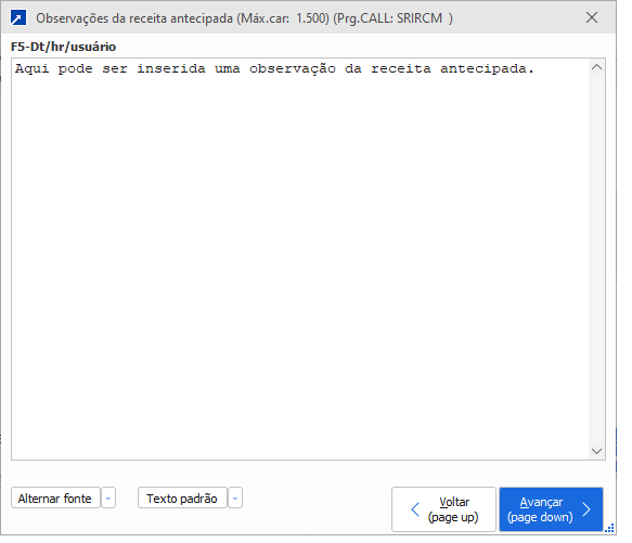 Botão para adicionar uma observação para a receita antecipada.