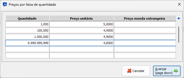 Obs.: quando configurado 1.1-P "Lista de preço por faixa de quantidade", esse campo de "Preço Unitário" é desabilitado, passando a exibir o botão [Preços p/faixa qtd], que abre a janela abaixo para informar os preços.