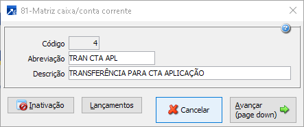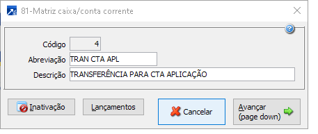 Lançamento de transferência entre contas (quando a empresa integra na contabilidade)Essa matriz pode ser utilizada para gravar as transferências entre contas, como exemplo, os bancos que realizam automaticamente a transferência de valores da conta corrente para conta de aplicação, neste caso configurar dois movimentos para gravar a saída da conta de movimento (conta corrente) e a entrada na conta de aplicação financeira. Para esse movimento deve-se criar uma matriz para cada banco, pois na matriz será informada a conta de aplicação específica do banco.Matriz para aplicação:O primeiro movimento sem Caixa/conta corrente nem conta contábil, pois ambos serão gravados do Caixa/conta corrente que está sendo conciliado, com o tipo a pagar ou a receber, conforme o tipo de extrato (entrada/saída) e definindo o tipo de lançamento contábil (débito/crédito), lançamento nas contas patrimoniais.Segundo movimento com Caixa/conta corrente de aplicação, com o tipo inverso do primeiro movimento e sem a conta contábil, essa conta será utilizada a conta informada no cadastro do Caixa/conta corrente, configurando o tipo de lançamento contábil (débito/crédito), lançamento nas contas patrimoniais.