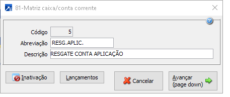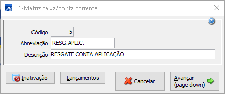 Matriz para resgate de aplicação:O primeiro movimento sem Caixa/conta corrente nem conta contábil, pois ambos serão gravados do Caixa/conta corrente que está sendo conciliado, com o tipo a pagar ou a receber, conforme o tipo de extrato (entrada/saída) e definindo o tipo de lançamento contábil (débito/crédito), lançamento nas contas patrimoniais.Segundo movimento com Caixa/conta corrente de aplicação, com o tipo inverso do primeiro movimento e sem a conta contábil, essa conta será utilizada a conta informada no cadastro do Caixa/conta corrente, configurando o tipo de lançamento contábil (débito/crédito), lançamento nas contas patrimoniais.