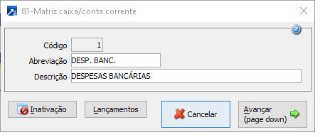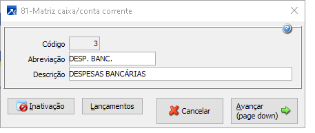 Lançamento de despesas bancárias (quando a empresa integra na contabilidade)Configurar dois movimentos para gravar a despesa na conta contábil do banco (conta patrimonial) e nas contas de despesas bancárias (conta de resultado).O primeiro movimento sem Caixa/conta corrente nem conta contábil, pois ambos serão gravados do Caixa/conta corrente que está sendo conciliado, com o tipo a pagar ou a receber, conforme o tipo de extrato (entrada/saída) e definindo o tipo de lançamento contábil, lançamento da despesa nas contas patrimoniais.Segundo movimento com Caixa/conta corrente de integração, com o mesmo tipo do Caixa anterior e com a conta contábil das despesas bancárias, configurando o tipo de lançamento contábil, lançamento da despesa nas contas de resultado.