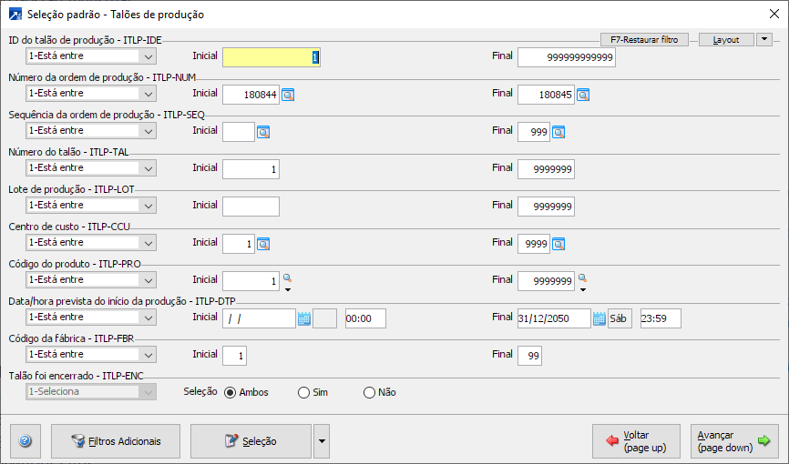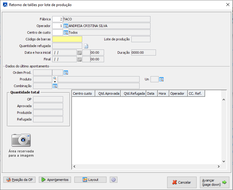 Obs.: Caso deixe a fábrica em branco, será carregada no apontamento a fábrica onde o talão foi programado.