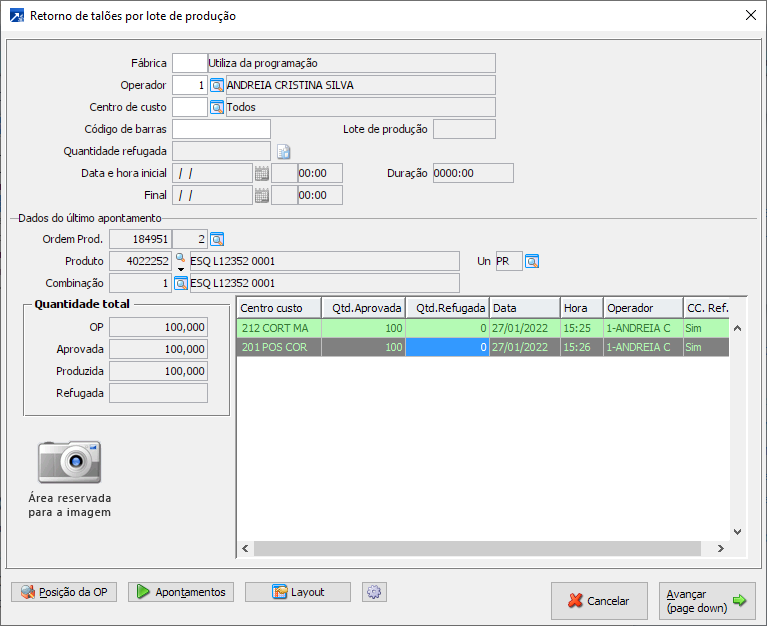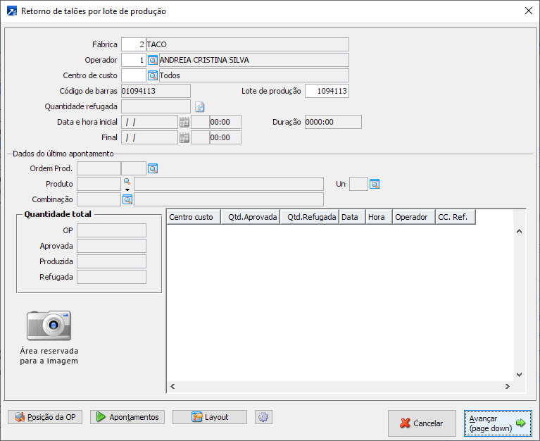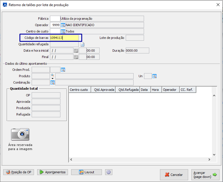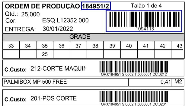 Quando o layout de OP é configurado através de um modelo configurável de RFP podemos colocar o campo do Lote de Produção do talão. Permitindo assim efetuar o apontamento por código de barras.