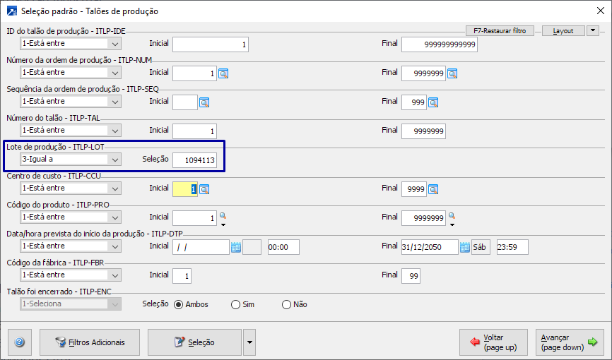 Caso seja necessário efetuar a impressão individual de um Lote de Produção, podemos filtrar o mesmo atrés do menu GIN 3.7-T, talão auxiliar.