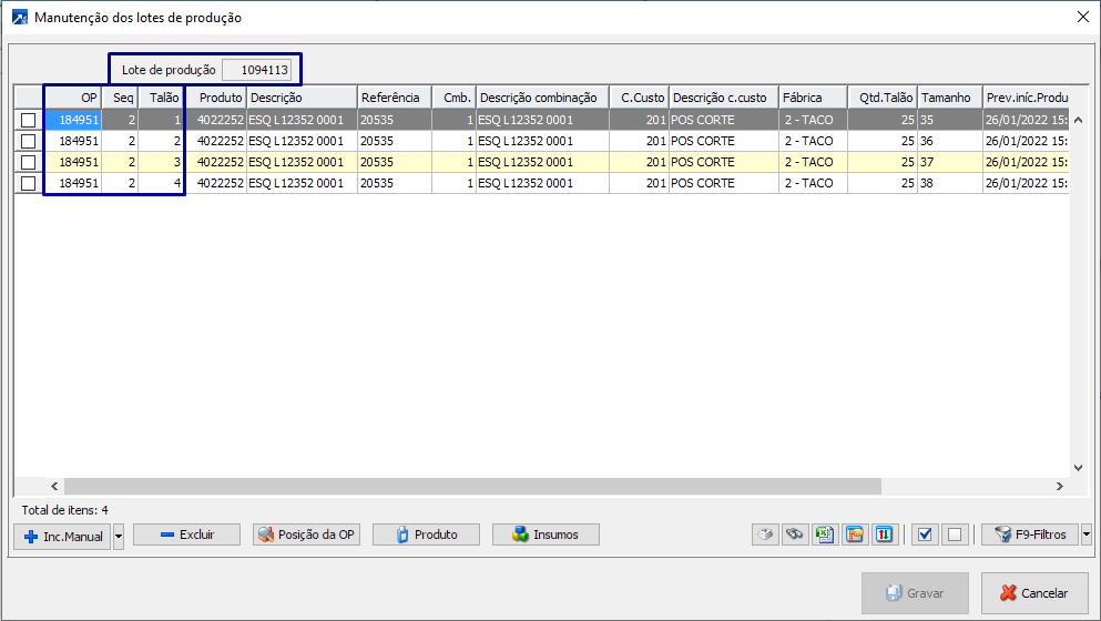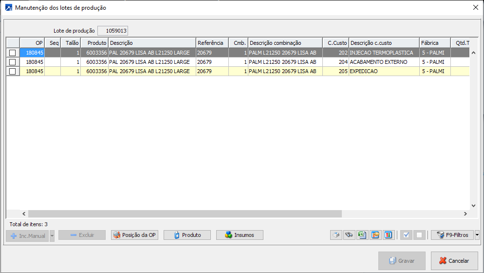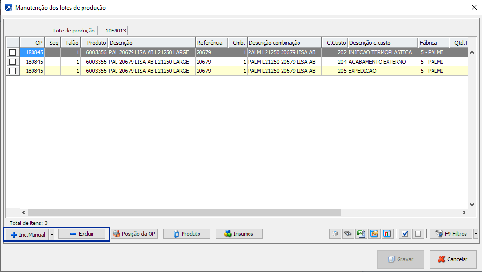 Já acessando o menu GIN 2.2-O, podemos excluir ou incluir algum item ao Lote de Produção: