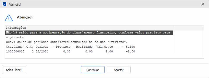 Nesse sentido o monitoramento on-line do SIGER® é uma ferramenta muito importe para o controle dos gastos na gestão financeira, a partir da validação do saldo previsto da conta de planejamento e dos diferentes pontos de validação, esse recurso auxilia neste controle, dependendo da configuração utilizada, o SIGER® atua na origem da despesa, assim evitando que sejam realizadas despesas que não estavam previstas, irá testar a cada movimento se o valor a ser gravado está dentro do previsto.