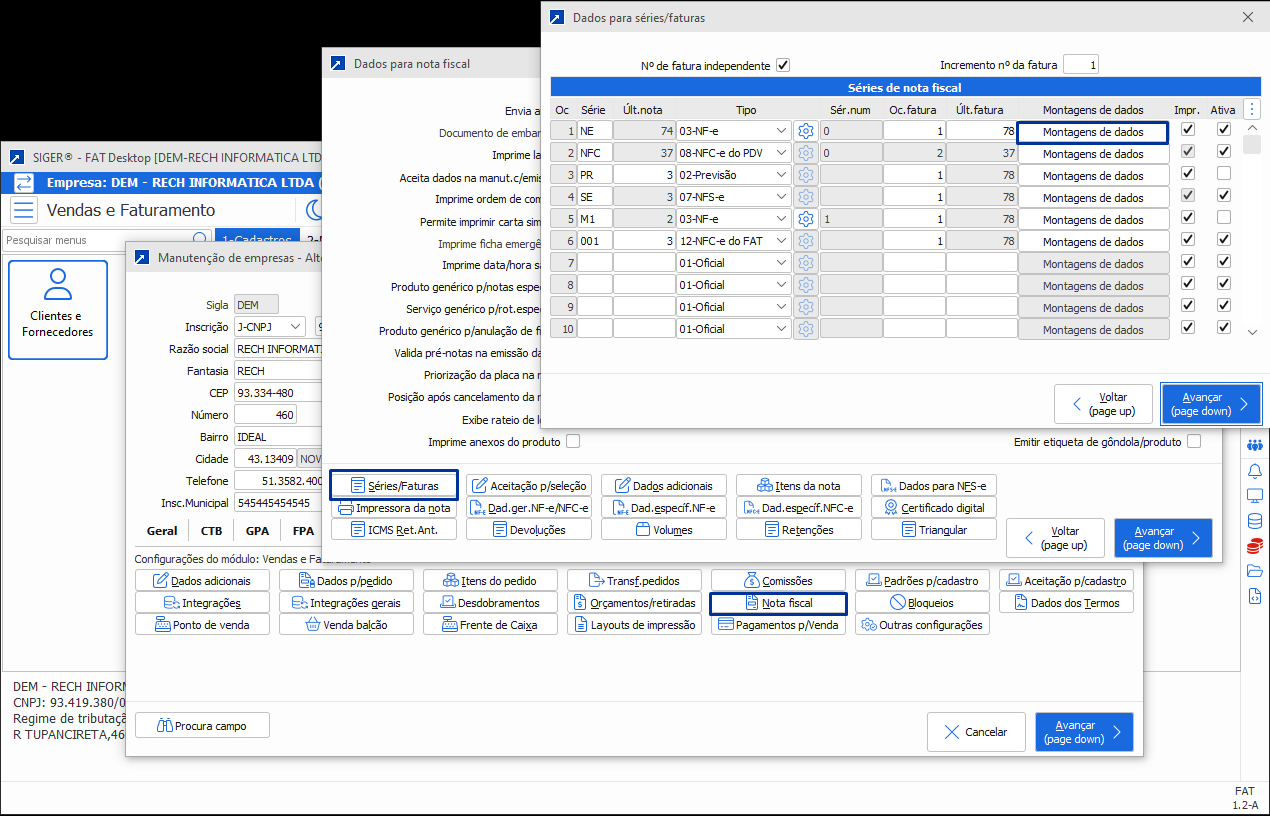 A opção poderá ser acessada através do menu 1.2-A - Manutenção de empresas - Alteração, botão [Nota fiscal], [Séries/Faturas], [Montagem de dados]. Note que para cada série de nota existe a possibilidade de montagem de dados.