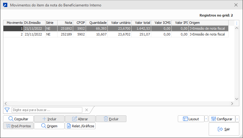 Janela de manutenção do movimento do item da nota de beneficiamento: