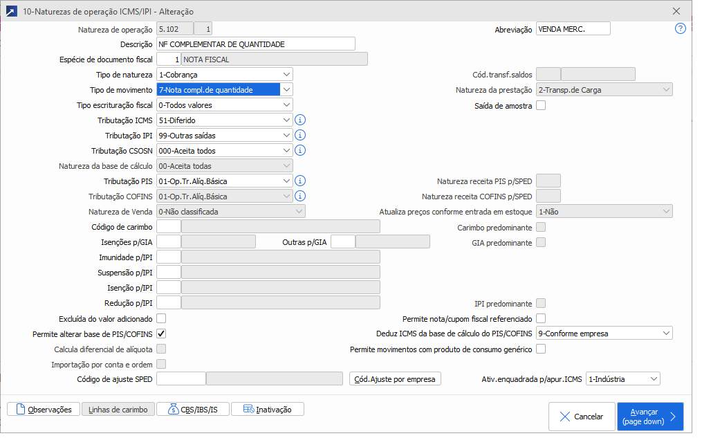O primeiro passo é configurar a CFOP que será utilizada na nota complementar de quantidade, ela deverá ser a mesma utilizada na NF-e que está sendo complementada, respeitando as CSTs dos impostos da nota original.