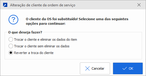 Na alteração do cliente para empresas configuradas com categoria veículos (), na janela abaixo é possível selecionar: apenas trocar o cliente, eliminar todos os itens ou então cancelar a troca do cliente. Confirmando a alteração, é possível recarregar o cliente a cobrar dos materiais e serviços para o novo cliente da OS.