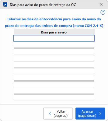 No menu COM 2.4 foi criada a opção "X-Aviso do Prazo de Entrega". A rotina processa somente os itens de Ordem de Compra que estão aguardando entrega.