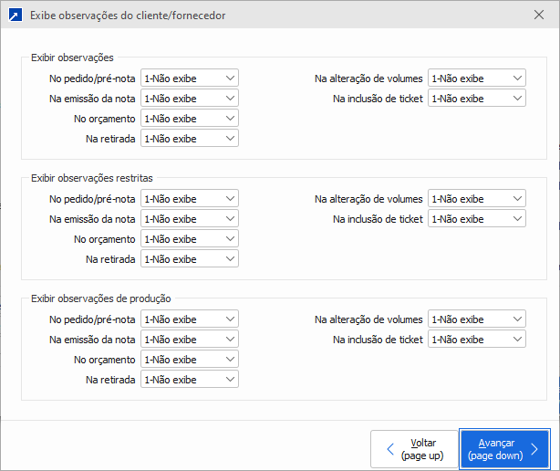 1-Não exibe: Não irá exibir as observações do cadastro do cliente.