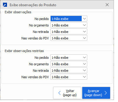 1-Não exibe: Não irá exibir as observações do cadastro do produto.