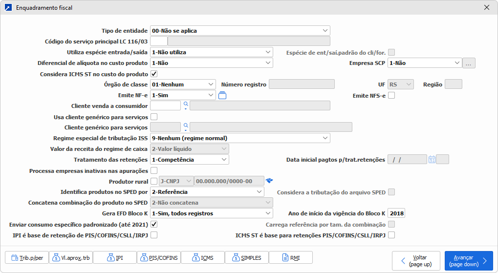 Configurações de enquadramento fiscal da empresa.