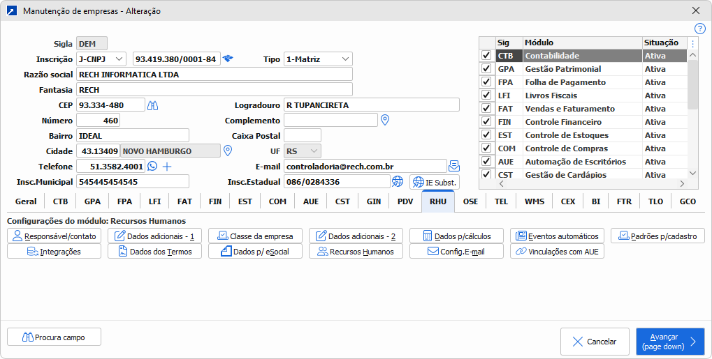 Empresa - Recursos Humanos Manutenção das parametrizações de empresa do módulo de Recursos Humanos, acessado pelo menu 1.2-A, aba RHU.