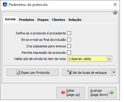 permite efetuar uma seleção dos locais de estoque que serão considerados para compor o saldo em estoque dos produtos vinculados ao protocolo.