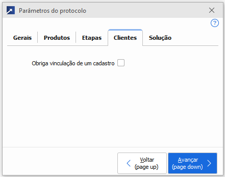 Obriga a vinculação de um cadastro: Se marcado, obriga a ter no mínimo um cadastro de cliente/fornecedor vinculado ao protocolo.5. Solução
