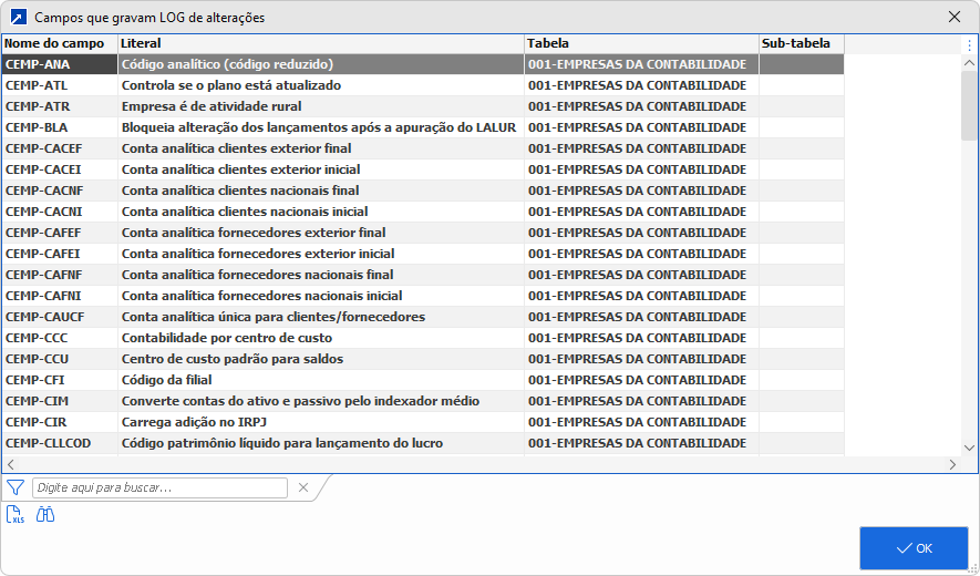 Tabelas marcadas permitem a gravação de LOG de alteração de campos.