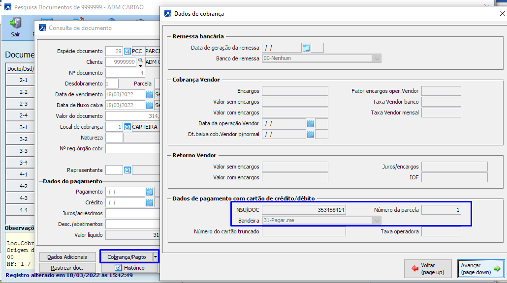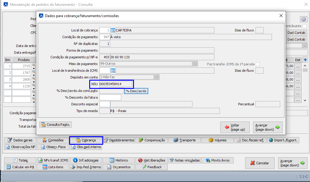 2) As vendas oriundas do site de e-commerce precisam ter gravado o número de NSU. Para conferir a informação pode ser acessado o botão "Cobrança" do pedido.