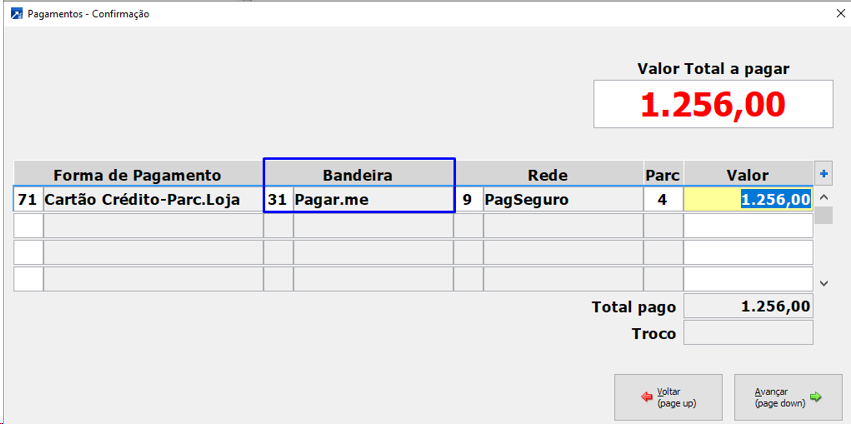 3) Na seleção de pagamentos do Frente de Caixa é necessário que seja selecionado a "Bandeira" do Pagar.me.