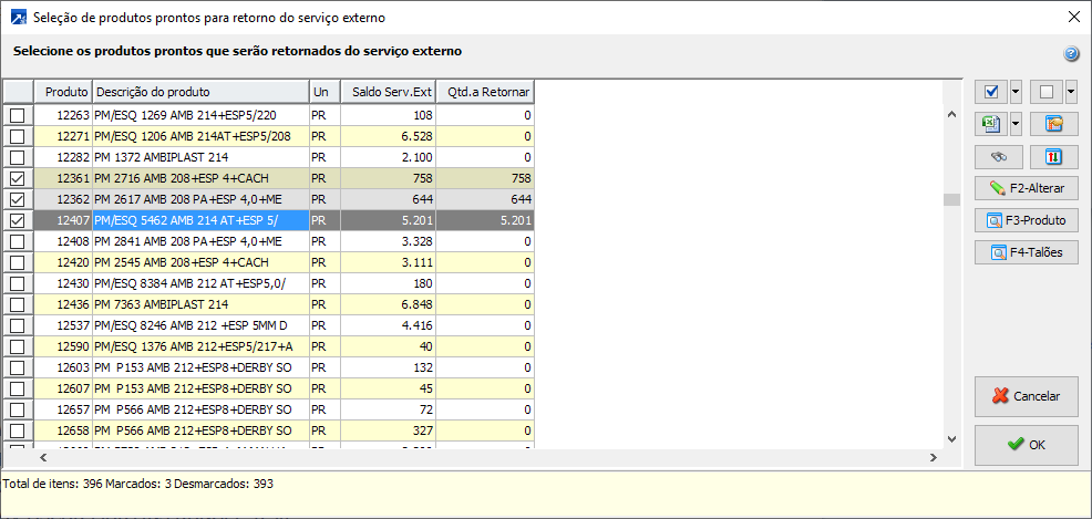 Após aceitar a seleção padrão, as ordens de produção são processadas e os produtos prontos que possuem saldo a retornar no serviço externo, são relacionados e aceitos para seleção conforme a janela abaixo.