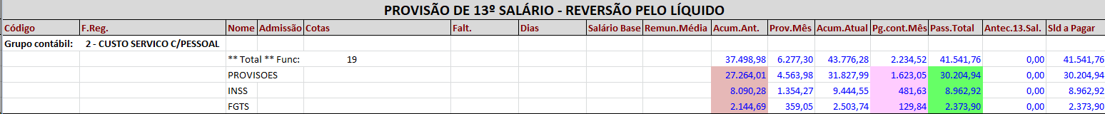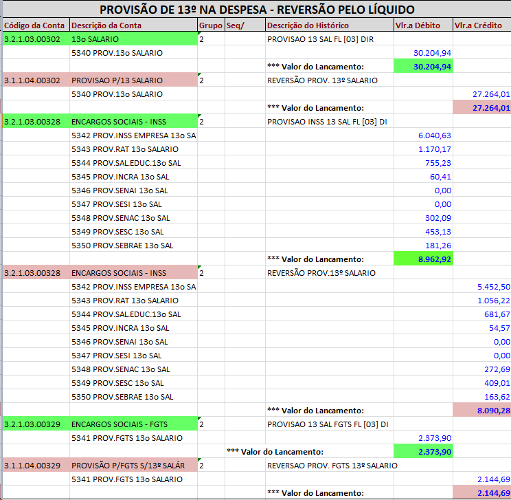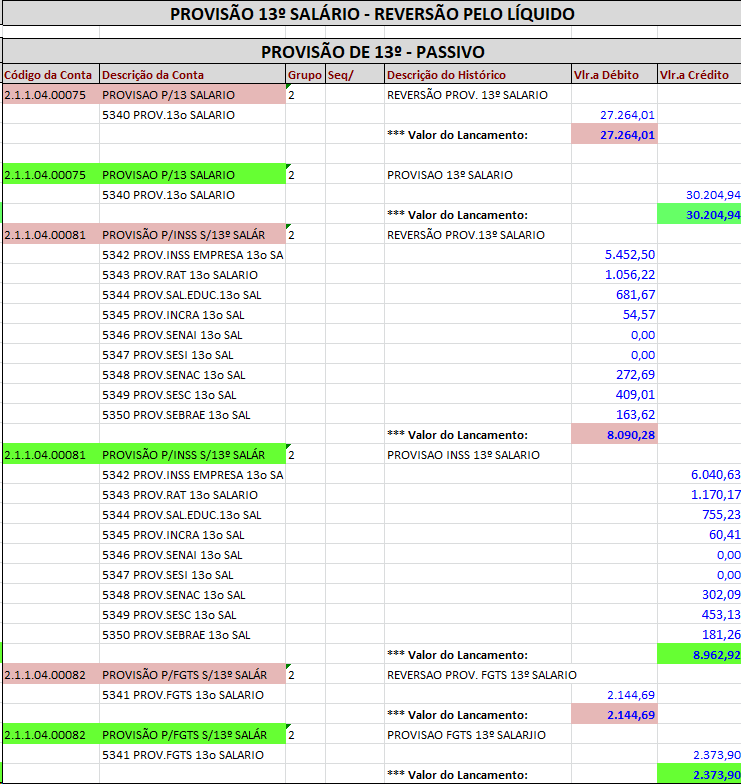 Provisão 13º Salário - REVERSÃO PELO LÍQUIDO