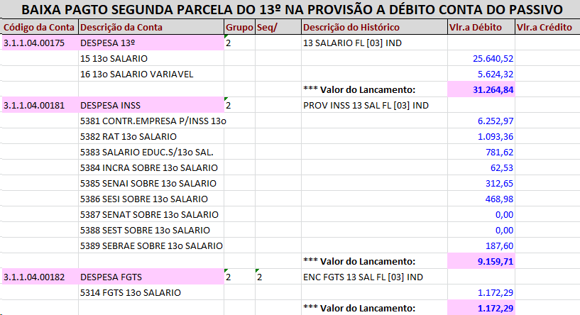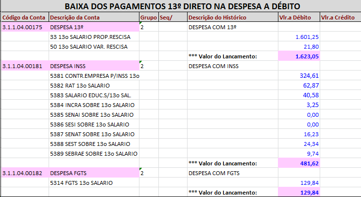 Observação: Todos os pagamentos de 13º que ocorrem na rescisão, serão debitados direto na despesa, Despesa com 13º salário, Despesa com FGTS de 13º salário e Despesa com INSS de 13º salário.