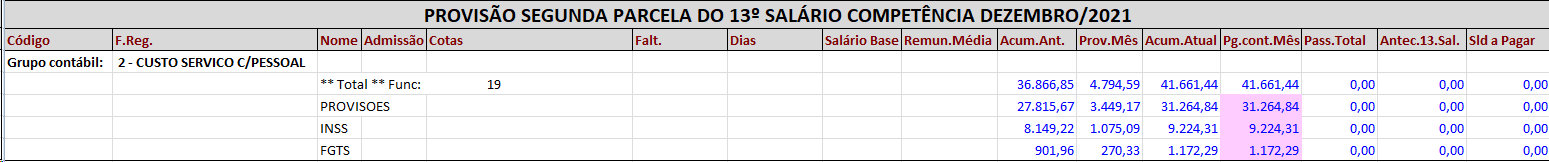 » Valor aqui representado pela coluna "Pass.Total", ou seja, para o mês atual irá considerar o valor bruto das provisões já descontado os valores pagos no mês.