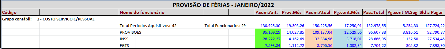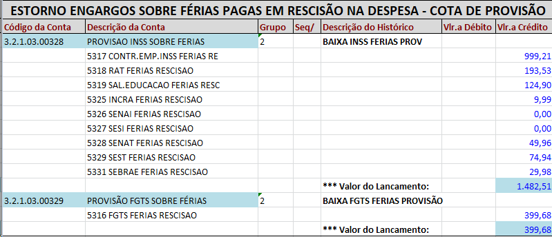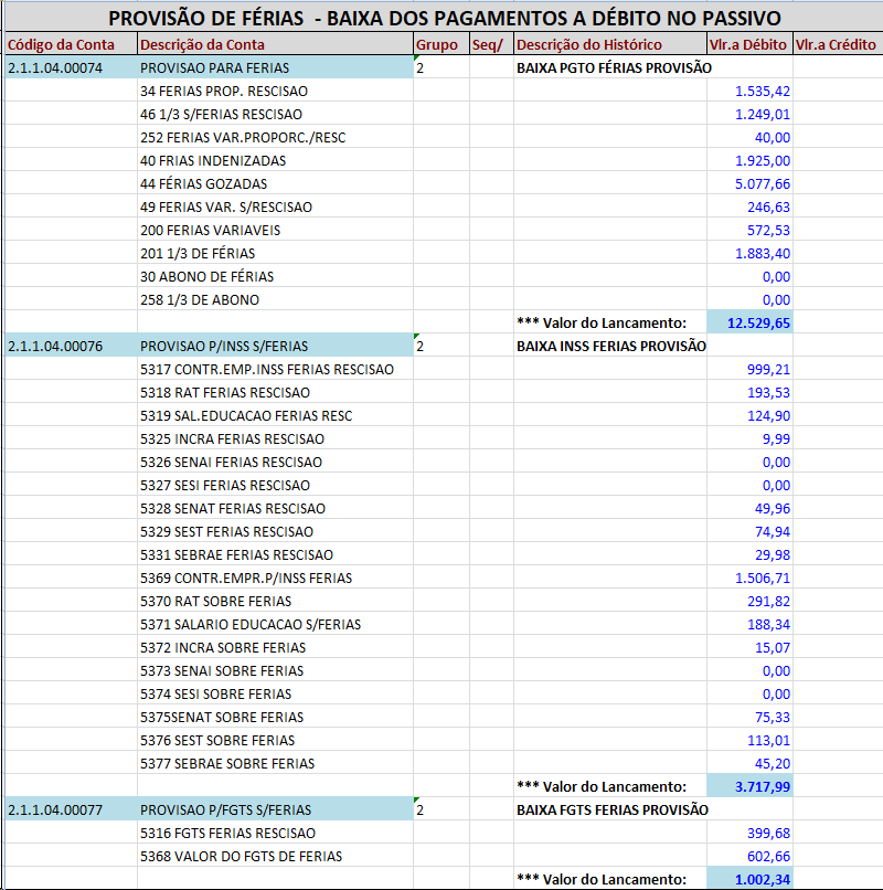 Nesta contabilização os valores já provisionados e pagos de férias por ocasião de gozo ou rescisão, estarão representados na coluna "Pg.cont.mês". Os eventos representativos destes valores serão estornados nas contas de provisão, ou seja, terá a mesma forma de estruturação utilizada no método de cota mensal.