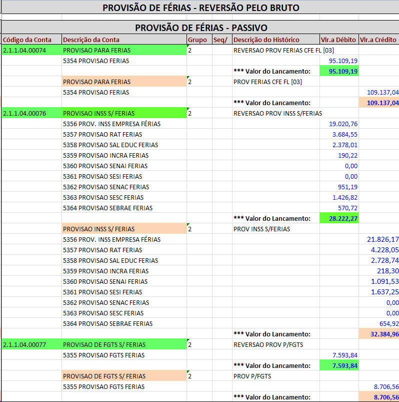 Provisão de Férias - REVERSÃO PELO BRUTO