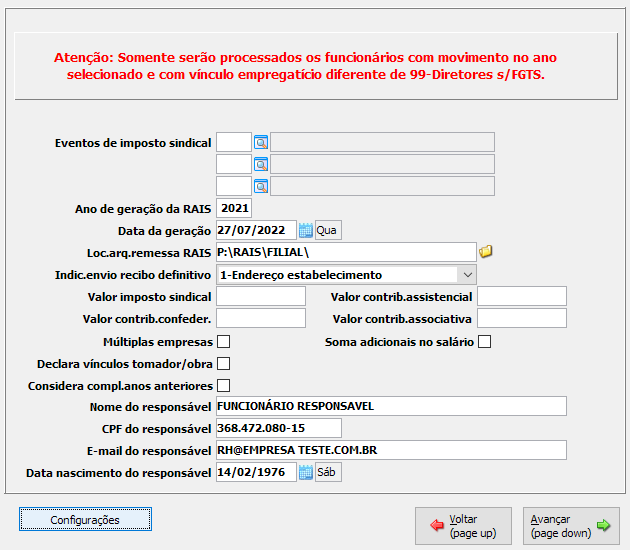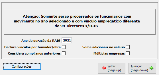 Observação: Quanto houver a necessidade de geração de declaração de anos anteriores ao ano base em vigor, a geração da mesma deve ser feita pela RAIS GENÉRICA, menu FPA 7.3-A.