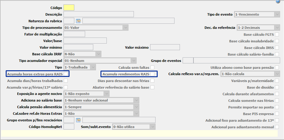 Os valores que compõe a remuneração dos funcionários RAIS, são definidos através da configuração dos eventos, menu FPA 1.7-A, pela check box “Acumula rendimentos RAIS” e "Acumula horas extras para RAIS".