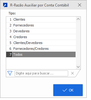 Ao acessar o menu serão exibidas as opções para emissão do Razão. Na janela "R-Razão Auxiliar por Conta Contábil" deve ser selecionado o tipo do Razão: clientes, fornecedores, etc.