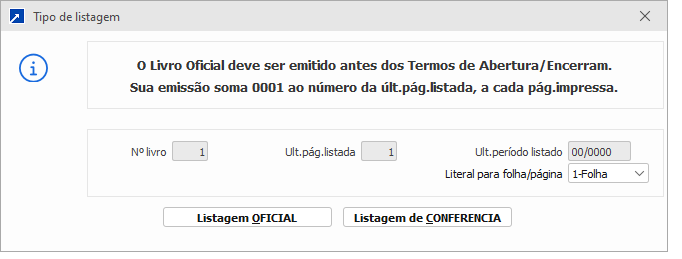Ao avançar será exibida a janela para seleção do tipo de listagem, onde devera ser selecionado se a listagem será oficial ou apenas para conferência.