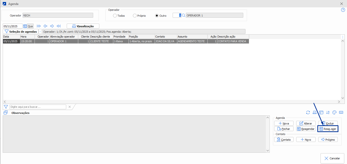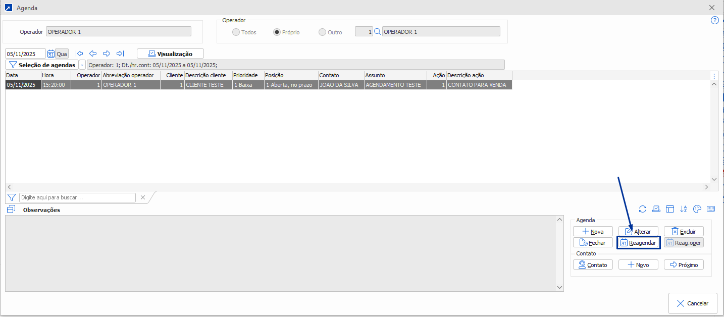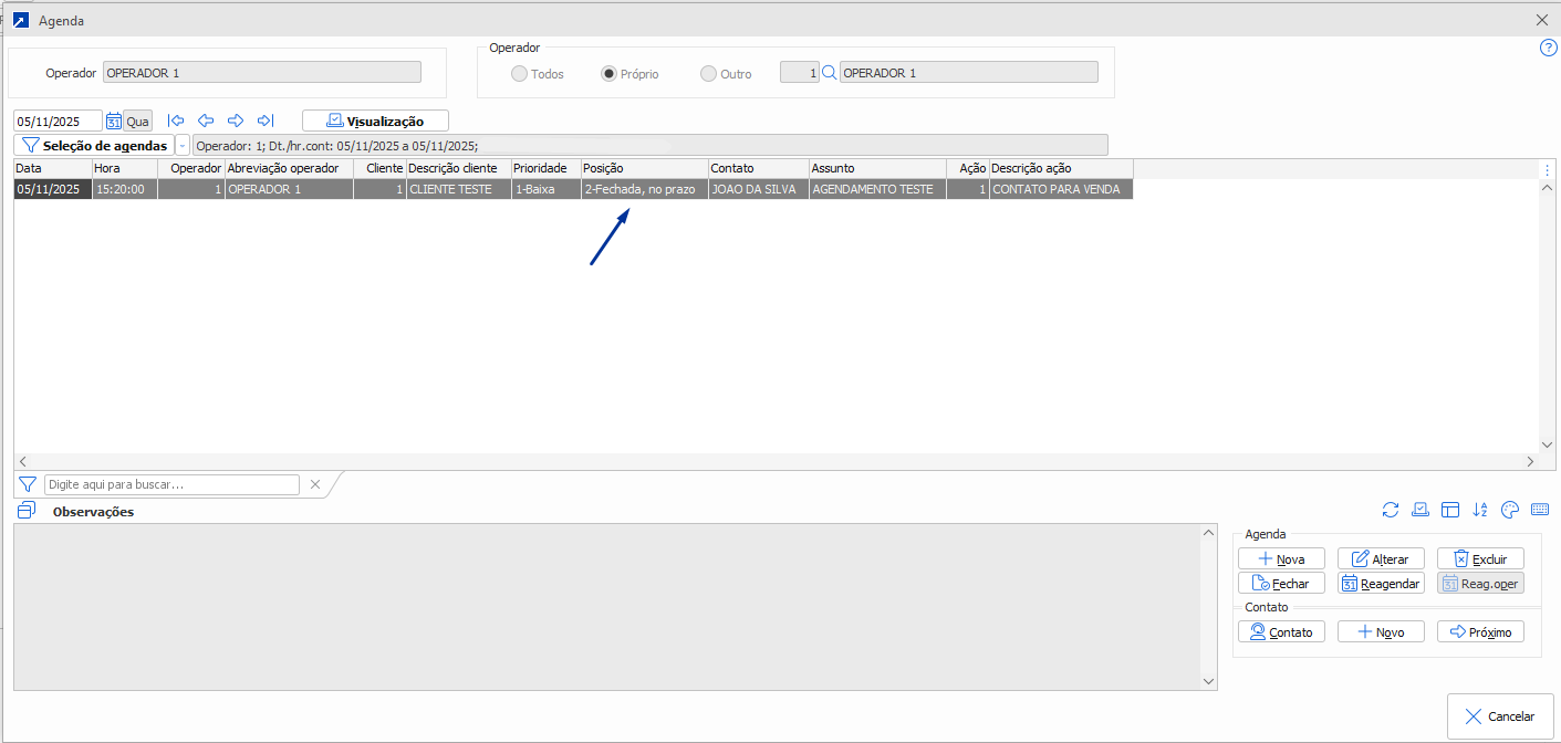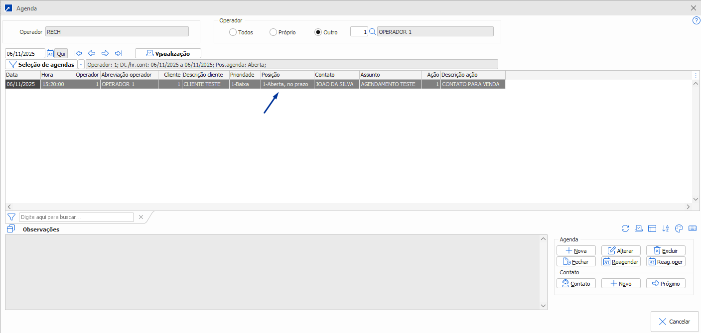 Situação prática: Agenda criada para o operador "Operador 1" dar retorno.