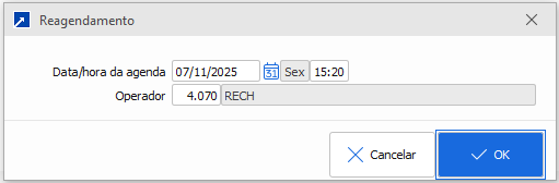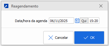 O sistema vai exibir uma tela de reagendamento onde será possível informar a data da nova agenda e o operador que irá fazer o contato.