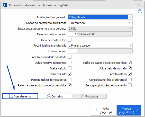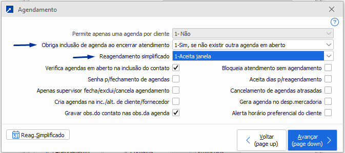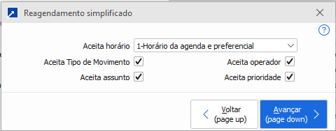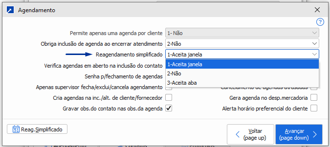 Detalhamento dos campos:"Aceita horário": Define se no reagendamento vai aceitar apenas horário da agenda ou se vai aceita apenas horário preferencial ou ambos;"Aceita Tipo de Movimento": Aceita código do tipo de movimento na janela de reagendamento simplificado? Para saber mais sobre os tipos de movimento clique aqui -> ;"Aceita assunto": Se aceita assunto (campo texto) no reagendamento;"Aceita operador": Se aceita operador (código) no reagendamento;"Aceita prioridade": Se aceita prioridade no reagendamento.Qual a diferença entre "1-Aceita Janela" e "3-Aceita Aba" ?Resposta: "1-Aceita Janela" irá abrir uma janela nova com as opções do reagendamento simplificado.Porém atentar: Para que a opção "1-Aceita Janela" funcione o campo "Obriga inclusão de agenda ao encerrar atendimento" deve estar com conteúdo diferente de 2-NãoExemplo: