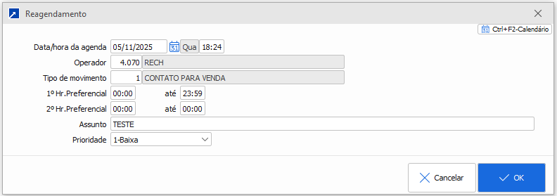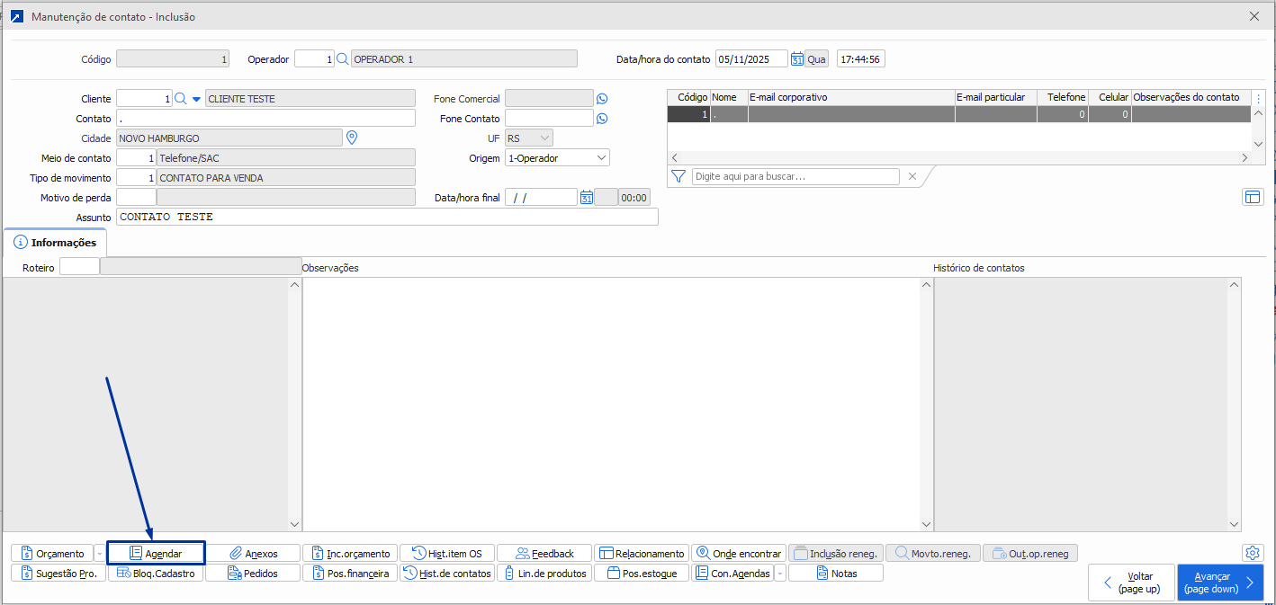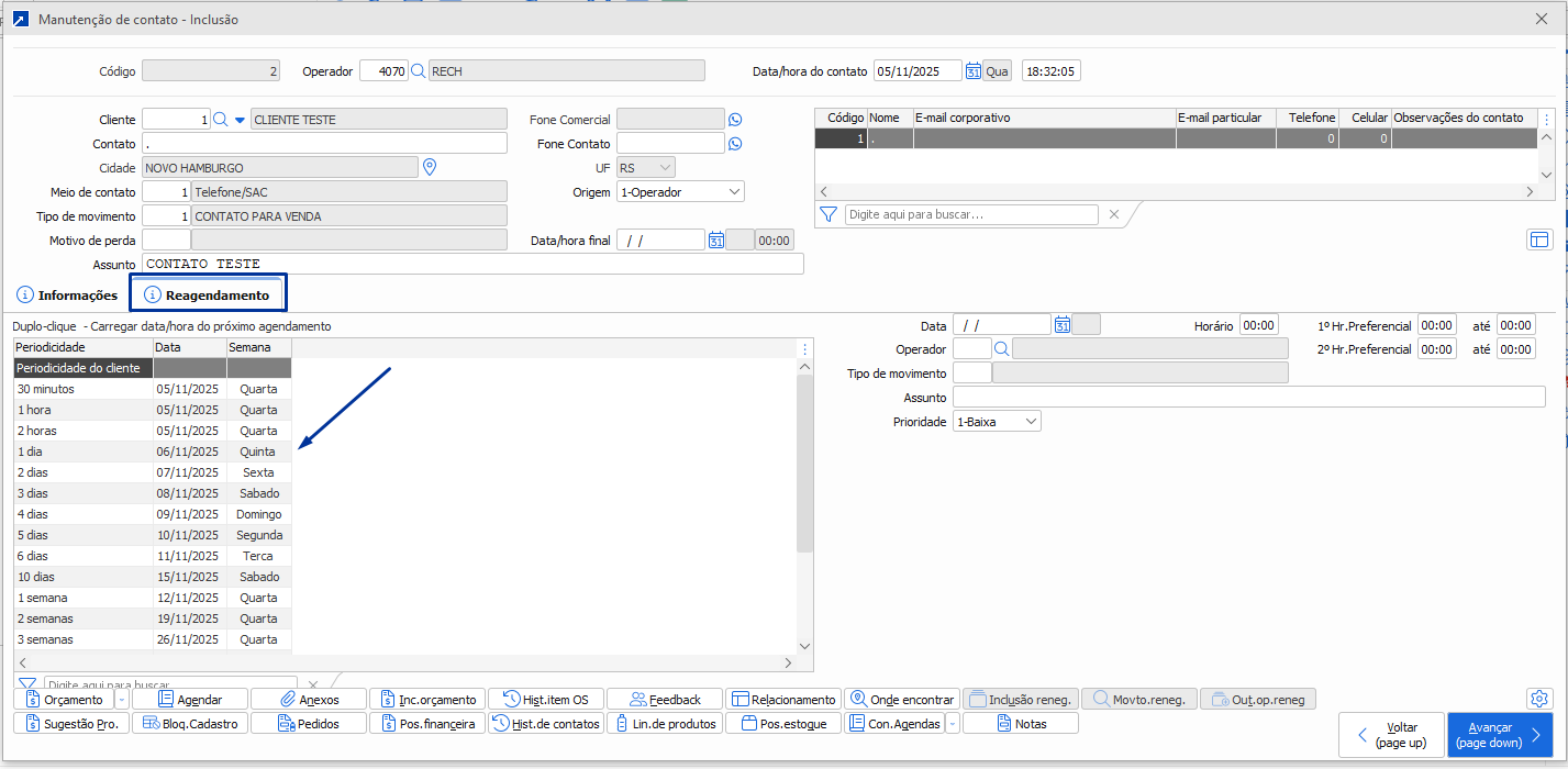 Então por dentro do registro do contato onde o operador está efetuando o cadastro da "ligação atual" ele já irá criar a nova agenda para posterior retorno conforme combinado com o cliente.