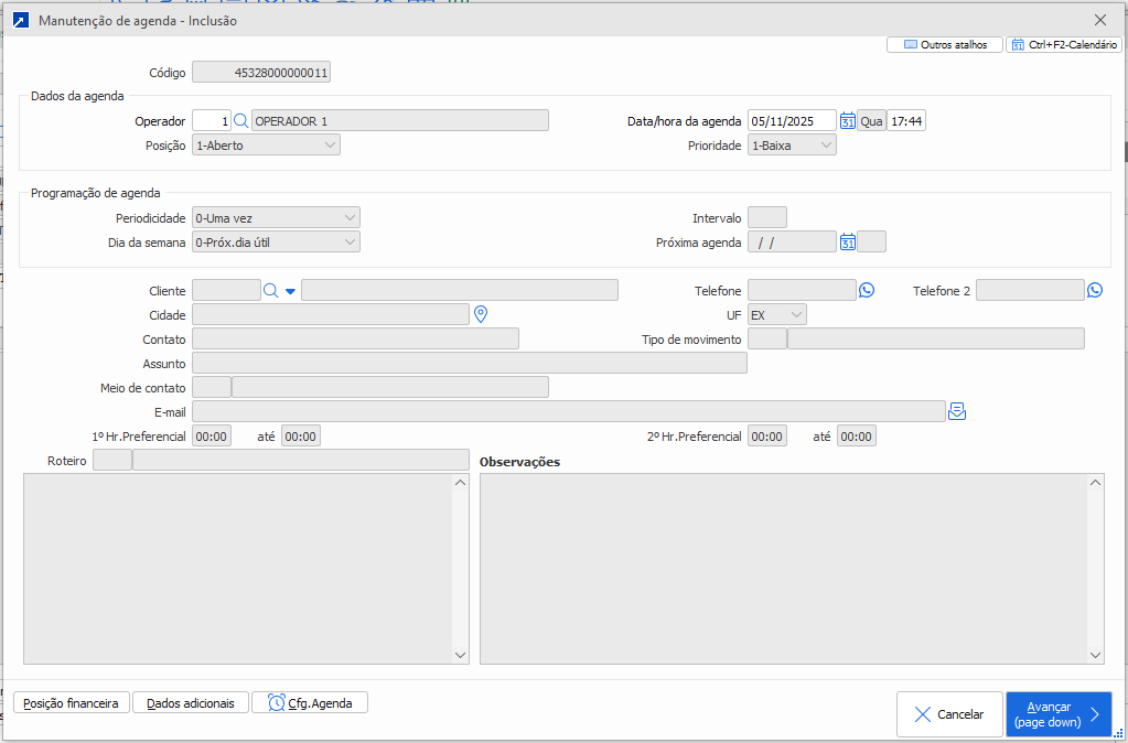 O sistema irá abrir a tela da agenda para inclusão do registro.