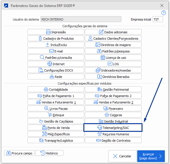 Habilitando o reagendamento simplificadoPara habilitar o reagendamento simplificado, siga os passos abaixo:Acessar o menu 1.1-P (pode ser a partir de qualquer módulo do sistema)Botão